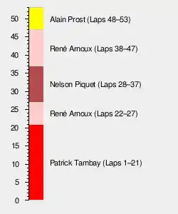 The 53-lap race was won by Alain Prost, driving a factory Renault, with Drivers' Championship rivals René Arnoux and Nelson Piquet second and third in a Ferrari and a Brabham-BMW respectively. With the win, Prost extended his lead in the Drivers' Championship to 14 points with four races remaining. However, this would turn out to be the final victory for the original factory Renault team.