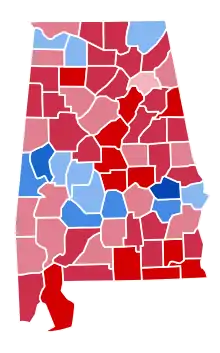Reagan won Alabama by a massive 22% landslide margin, a dramatic shift from 1980, when Reagan had won it by just 1.3% over Southerner Jimmy Carter. This was only the third time that the Republican nominee exceeded 60% of the vote in the Yellowhammer State, after Barry Goldwater in 1964 and Richard Nixon in 1972. Mondale carried most of Alabama's Black Belt counties, but outside these predominantly African-American counties, he carried only Colbert, Lawrence, and Jackson Counties, which lay within the region served by the Tennessee Valley Authority (Colbert is home to Muscle Shoals). Overwhelmingly, the state's 'Wallace country' went red this election, unlike in 1976 or even 1980.[3] As an example, Reagan claimed over 2/3 of the vote in Coffee County, Alabama, which had voted for Carter in 1976 by over 20% and had voted for Reagan in 1980 by just 4.7%.[4]