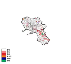 Christian Democracy was by far the largest party, gaining more than double of the share of vote of its main competitors, the Italian Communist Party, which had its worst result ever in a regional election, and the Italian Socialist Party, that obtained its best result ever.