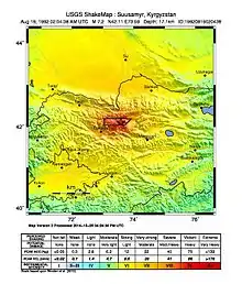The 1992 Suusamyr earthquake occurred at 02:04 UTC on 19 August near Toluk in the border area of Kyrgyzstan. The shock had a surface wave magnitude of 7.5 and a maximum felt intensity of IX (Violent) on the Mercalli intensity scale. It was a result of reverse faulting.[2] The death toll from the event amounted to about 75, including 14 people who were killed by landslides.