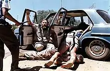 AWB Colonel Alwyn Wolfaardt, AWB General Nicolaas Fourie and Veldkornet (Field Cornet) Jacobus Stephanus Uys were driving a blue Mercedes-Benz W108 at the end of convoy of AWB vehicles that had been firing into roadside houses.[22] Members of the Bophuthatswana Defence Force returned fire and hit the driver of the car, Fourie, in the neck; another gunman, Wolfaardt, in the arm; and the remaining passenger, Uys, in the leg. Wolfaardt stumbled out of the car and brandished a handgun but was advised by the onlookers not to start shooting. A Bophuthatswana police officer relieved him of the weapon. Ontlametse Menyatsoe approached and spoke to Wolfaardt, asking if he was a member of the AWB. Wolfaardt confirmed this, reporting that they had been dispatched from Naboomspruit. He then pleaded for the lives of his two injured fellows. In response, Menyatsoe shot the three wounded men dead at point blank range with an R4, shouting angrily, "Who do you think you are? What are you doing in my country?" The killing was captured by the nearby journalists and broadcast worldwide.