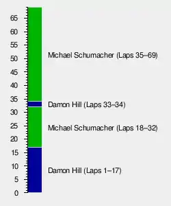 In a race of high reliability, nineteen cars were still running at the end, the last being Schiattarella (albeit five laps down), while Mansell was the last driver to retire, spinning off on lap 48. Schumacher's eventual margin of victory over Hill was 24.6 seconds, with another 45 seconds back to Häkkinen and a further nine back to Irvine, the last driver on the lead lap. Berger and Frentzen completed the top six, Frentzen holding off Katayama for the final point by 0.2 seconds.[3] With two races remaining, Schumacher led Hill in the Drivers' Championship by five points, while Benetton moved back into the lead of the Constructors' Championship by two points from Williams.