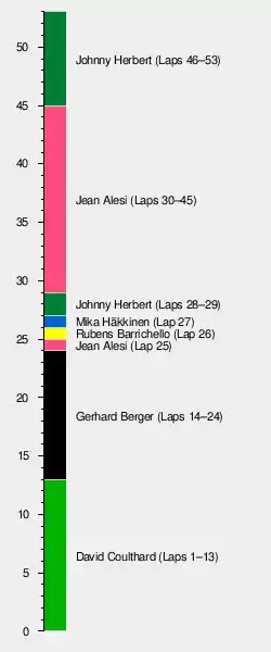 After the pitstops the Ferraris were running first and second. Berger suffered a bizarre retirement when a TV camera on Jean Alesi's rear wing flew off and destroyed Berger's suspension. Alesi looked set to win his second Grand Prix but subsequently retired with a wheel bearing failure with just 8 laps to go.[5] Alesi had also retired from the lead the previous year. This succession of retirements handed a second victory to Johnny Herbert, and then best-ever results to Mika Häkkinen and Heinz-Harald Frentzen - the first podium finish for the Sauber team in F1. Papis was on course for his first points finish, until he was overtaken by Boullion on the final lap.[6]