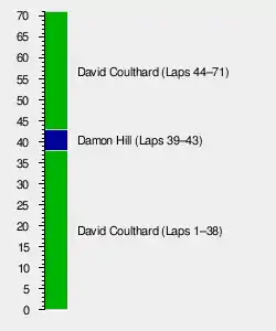 Two practice sessions were held before the race; the first was held on Friday morning and the second on Saturday morning. Both sessions lasted 1 hour and 45 minutes with weather conditions dry throughout.[4] Häkkinen set the fastest time in the first session, posting a lap of 1:23.073, one-tenth of a second quicker than Hill and Schumacher, in second and third places respectively. Coulthard was fourth, with the Ferrari cars fifth and sixth fastest; Gerhard Berger ahead of Jean Alesi.[1] Häkkinen was eleventh in the second practice session, two seconds slower than Hill, who was fastest with a time of 1:21.443. Coulthard was second in the Williams, eight-tenths of a second behind Hill. Schumacher was third, with Alesi fourth, both over a second behind Hill. Heinz-Harald Frentzen in a Sauber was fifth with Martin Brundle in the Ligier, Eddie Irvine in a Jordan and Berger rounding out the top eight positions.[1]