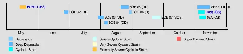 The 1997 North Indian Ocean cyclone season had no bounds, but cyclones tend to form between April and December, with peaks in May and November. These dates conventionally delimit the period of each year when most tropical cyclones form in the northern Indian Ocean.