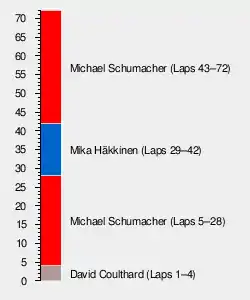 The two Saubers collided en route to the grid. At the start of the race, Michael Schumacher was caught out by Mika Häkkinen, while David Coulthard maintained his first place. Schumacher passed Häkkinen at the start of the second lap. On the same lap Eddie Irvine overtook Heinz-Harald Frentzen. By lap 4, Schumacher caught up with Coulthard, and on the next lap the Scotsman took the wrong line, and Schumacher went past. The two cars touched, and Coulthard slid off the track, and rejoined in sixth place. The race then became one between Schumacher, stopping twice, and Häkkinen, on a one-stop strategy. Schumacher's plan proved to be the right one, as he emerged in front following his second stop, after Häkkinen lost time behind Heinz-Harald Frentzen. Behind Häkkinen and the two Ferraris, Jacques Villeneuve was under attack from Jean Alesi and Coulthard. When Esteban Tuero came into the pits, one of his tyres was missing. Eventually, one of the mechanics found it in the garage. Coulthard was slowed by gearbox problems and lost further ground when he tangled with Jacques Villeneuve, putting the Canadian out, while the Scot collected the solitary point for sixth place behind Häkkinen, Eddie Irvine, Alexander Wurz, and Sauber's Jean Alesi. In the lead, Schumacher collected the victory.