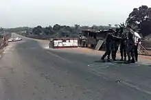 The first clashes between Taylor's and Johnson's followers took place in February 1998 after Johnson had travelled to Nigeria and met with President Sani Abacha.[5] Taylor, who was generally extremely hostile toward Nigeria and resented its influence over West Africa,[10] believed that Johnson's trip indicated that his rival and the Nigerian government plotted to overthrow him. Thus, when Johnson returned later that month, Benjamin Yeaten's feared Special Security Service (SSS) arrived at Roberts International Airport to apprehend him. The former warlord's guards fought back, however, and eventually Johnson had to be transported back to Monrovia protected by heavily armed Nigerian peacekeepers. The SSS again attacked Johnson's followers in March, as he travelled to the United States for medical treatment. Taylor once again believed that his rival's trip was in reality an attempt to plot against his government.[5] The United States' government, however, had little interest in getting involved in the disputes between the two Liberian politicians as it mistrusted both.[2] On 6 June, six members of Johnson's faction were apprehended by security forces at Roberts International Airport and "disappeared".[8]