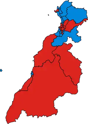 ![]() A map highlighting party support by electoral ward where red represents the Scottish Labour Party and blue the Scottish Conservative Party. | ||||||||||||||||||||||||||||