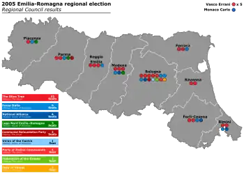 | Centre-left coalition | The Olive Tree | 44.5 | 19 | Vasco Errani | ||