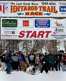 The ceremonial start of the 33rd annual Iditarod Trail Sled Dog Race across the US state of Alaska began in Anchorage on March 5, 2005 at 10 am AKST (19:00 UTC), and restarted in Willow the next day at 2 pm (23:00 UTC). After covering 1,161 miles (1,868 km)[1] of wilderness, musher Robert Sørlie, an airport firefighter from Norway, crossed the finish line under the "burled arch" in Nome on March 16 at 8:39 am AKST (17:39 UTC). After taking care of his dogs, and an inspection to make sure all the mandatory equipment was in his sled, Sørlie was declared the winner by Race Marshal Mark Norman, with a time of 9 days, 18 hours, 39 minutes, and 31 seconds and won US$72,066.67 and a new truck. When asked how it felt to win a second time, Sørlie said "it feels good, I'm ready for breakfast."[2] His team of dogs averaged 4.65 mi/h (7.58 km/h). The Red Lantern in last was Phil Morgan, an Alaska Airlines pilot, and when he crossed the finish line on March 21 at 8:02 pm AKST (March 22, 5:02 UTC), the Widow's Lantern hanging on the burled arch was extinguished, which signaled the end of the race.