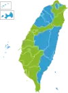 County-level units won by the Democratic Progressive Party (green) and the Kuomintang (blue).