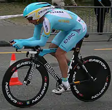 Astana was one of 21 teams invited to the Tour de France. Vinokourov and Klöden were the squad's co-captains, with Kashechkin their main lieutenant and prepared to be a protected rider should either or both of them falter.[52] Vinokourov and Klöden showed well in the prologue time trial, with Klöden second and thus the wearer of the green jersey in Stage 1, with Vinokourov seventh.[53] Klöden stayed out of trouble in Stages 1 through 6, which all featured sprint finishes, but Vinokourov first fell from the top ten due to time bonuses obtained by sprinters and then when he lost over a minute in Stage 5, crashing before the final climb.[54] The high mountain Stages 7 and 8 saw Klöden fall as well, first as a breakaway in Stage 7 was afforded enough time to shake up the top ten[55] and then as Vinokourov and Klöden were both over four minutes off the winning pace of Michael Rasmussen in Stage 8. This stage, however, saw the rise of Kashechkin to fifth overall.[56] In the next stage, after the first rest day, Klöden rebounded with a 9th place finish to return to the top ten, at seventh overall. Vinokourov was, at this point, 21st.[57]