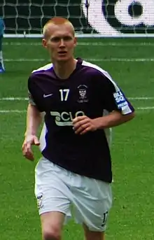 After the season ended, York released Greaves, Hogg, McBreen, Pejic, Radcliffe, Robinson, Rusk, Shepherd, Christian Smith and Wilkinson.[139][140][141][142] Boyes, Farrell, Darren Kelly and Sodje left for Scunthorpe, Rushden, Portadown and Barnsley respectively.[143][144][145][146] Brodie, McWilliams, Mimms and Purkiss signed new contracts with the club.[139][140][147] Over the summer York signed defenders James Meredith from Shrewsbury Town,[148] Alan O'Hare from Mansfield[149] and Djoumin Sangaré from Salisbury,[150] midfielders Neil Barrett from Ebbsfleet,[151] Andy Ferrell from Kidderminster,[147] Alex Lawless from Forest Green,[152] Mackin from Wrexham,[148] winger Craig Nelthorpe from Oxford,[147] and strikers Michael Gash from Ebbsfleet,[153] Richard Pacquette from Maidenhead United[148] and Michael Rankine from Rushden.[144] Striker Michael Emmerson was promoted from the youth team after he signed a professional contract with the club.[154]