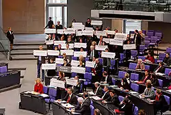 While initially downplayed by the German government which was busy in an election campaign at the time,[22] the airstrike then dominated political debates in Germany for several months and in November 2009 led to the resignation of German labor minister Franz Josef Jung, who was defense minister during the attack.[23] In early 2010, further material came to light, especially about the political handling in the German government, which brought further pressure on a number of people, including Karl-Theodor zu Guttenberg, the new defense minister. The major German newsweekly Der Spiegel, in an exhaustive research article published in February 2010, called the incident a war crime due to the fact that the attack on the tankers had broken a number of rules of conduct, and had led to a later cover-up.[22]