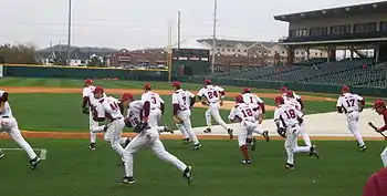The Razorbacks began the 2010 campaign on February 19 with a 10–2 victory over the Ball State Cardinals. Hogs starter Mike Bolsinger earned the win, and Andy Wilkins provided two hits, 2 RBI, and a solo home run. Every Razorback starting player recorded at least a base hit in the contest.[3] It was a different story in game two, however, as Ball State took a lead in the first inning and did not relinquish it. Geoffrey Davenport would continue after the shaky start to pitch effectively for four innings, including striking out the side in the fourth. The Razorbacks left twelve runners on base, and committed four defensive errors.[4] Game three was initially delayed fifteen minutes due to rain, but once the game started, Brett Eibner and Drew Smyly pitched well. Designated hitter Monk Kreder, a junior college transfer native to Keller, Texas, collected three hits. Six different Razorbacks scored in the 9–3 victory.[5]