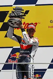 Casey Stoner, lifting his trophy on the podium after winning the MotoGP race.