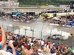 New Hampshire Motor Speedway is one of ten intermediate tracks to hold NASCAR races; the others are Atlanta Motor Speedway, Charlotte Motor Speedway, Chicagoland Speedway, and Darlington Raceway as well as Homestead Miami Speedway, Kansas Speedway, Kentucky Speedway, Las Vegas Motor Speedway, and Texas Motor Speedway.[6] The standard track at New Hampshire Motor Speedway is a four-turn oval track, 1.6 miles (2.6 km) long.[7] The track's turns are banked from two to seven degrees, while the front stretch, the finish line, and the back stretch are banked at one degree.[7]