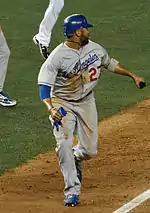 The Dodgers returned home from the long road trip for a key divisional series with the San Francisco Giants. In the first game of the series, Kershaw allowed only two runs in 8 innings while striking out 10 but it wasn't enough as Madison Bumgarner also struck out 10 in 8 innings, but didn't allow any runs. The Dodgers lost 2–1 to fall back behind the Giants in the divisional race.[152] The Dodgers also dropped the next game, 4–1, as Tim Lincecum shut down the Dodgers offense and Joe Blanton struggled.[153] The Giants again pounced on the Dodgers early in the series finale, scoring 3 runs in the top of the 1st and coasting to an 8–4 victory that dropped the Dodgers 21⁄2 games back in the division. This was the Giants first three-game series sweep over the Dodgers at Dodger Stadium since 2007.[154] The Dodgers made up for the drought against the Giants by scoring runs in bunches against the Marlins and former teammate Nathan Eovaldi. Juan Rivera, Andre Ethier and Hanley Ramírez all homered in the 11–4 win.[155] The Dodgers and Boston Red Sox made a trade on August 25, considered by many to be the "biggest August trade in MLB history" which sent James Loney and four minor leaguers to the Red Sox for Adrián González, Josh Beckett, Carl Crawford and Nick Punto. González made a huge splash with his new team, smashing a three-run home run off Marlins ace Josh Johnson in his first at-bat with his new team. The Dodgers offense did not look back, running up 16 hits in the 8–2 win. Andre Ethier got his tenth straight base hit, breaking the L.A. Dodger record set by Ron Cey in 1977 and tying the franchise record set by Ed Konetchy in 1919.[156] The Marlins hit four home runs off the Dodgers the next day to win the series finale 6–2. Giancarlo Stanton hit home runs in each game of the series for the Marlins.[157]