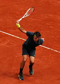 Federer next played at the Italian Open in Rome. He received a bye into the second round where he met and comfortably beat Carlos Berlocq of Argentina in straight sets.[33] In the third round, he played 2001 champion Juan Carlos Ferrero and defeated him in three sets after Ferrero had won the second set by converting a break.[34] Federer then faced hometown favorite Andreas Seppi in the quarterfinals, but defeated him by a comfortable margin, dropping only three games en route to a straight sets win.[35] Federer next lost to first-seeded Novak Djokovic in the semifinal in straight sets, after failing to gain enough momentum to overcome Djokovic in the second-set tiebreak.[36] As Nadal ultimately won the tournament, Federer dropped to world No. 3 rank.