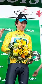 Navardauskas' time was marginally quicker than the times of Rabobank's Maarten Wynants and his own Garmin–Barracuda team-mate David Zabriskie, with the trio of riders maintaining their lead positions until the end of the second wave of riders, when Martin Velits assumed the lead for Omega Pharma–Quick-Step.[13] Velits completed the course four tenths of a second faster than what Navardauskas had achieved; but he was to only hold the lead for around quarter of an hour, as in the third wave of riders to start the prologue, Stef Clement took the lead for Rabobank; the former Dutch national champion in the discipline completed the course in slightly over 3' 37".[15] Clement's time held for a while, as riders struggled to match the pace that he had set; it was not until Giacomo Nizzolo, a rider regarded as a sprinter at the RadioShack–Nissan team, recorded a time of 3' 34".[13] Only one rider bettered his time for the course, and it was the rider that started immediately after him; Geraint Thomas (Team Sky) set the fastest time of 3' 29",[16] taking his team's fourteenth victory of the year, and his first since returning to the roads after a successful UCI Track World Championships,[17] where he claimed a gold medal and a silver medal. Although he won the stage, Thomas' focus for the race was to support Mark Cavendish and Bradley Wiggins in their respective classifications.[18]