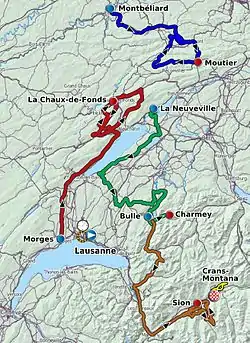 - 25 April 2012 — Morges to La Chaux-de-Fonds, 184.5 km (114.6 mi)[21]
