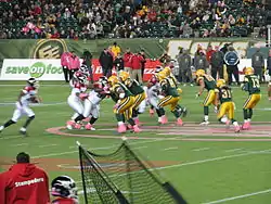 The Calgary Stampeders play the Edmonton Eskimos at Commonwealth Stadium on Friday, 18 October 2013. The Stampeders beat the home town Eskimos by a score of 27-13. Each year the CFL sets aside a weekend to raise awareness for women's cancers and players wear pink tape and gloves to highlight this awareness.