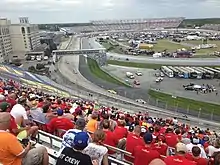At the halfway point of the race, cloud cover began to increase.[15] Busch's lead narrowed and Johnson caught up to him. Johnson eventually passed Busch for the lead on lap 206.[16][17] He maintained the lead after a round of green-flag pit stops.[16] On lap 279, Truex, Jr. blew an engine, bringing out another caution on lap 280.[15][17] The leaders pitted during the caution, and Johnson won the battle off pit road. He would lead the race after the restart.[16] On lap 299, there was a wreck involving Ryan Newman and David Gilliland on the backstretch.[15][17] This wreck brought out the fifth caution of the race on lap 301, in which Hamlin would lead at the restart following different pit strategies. Hamlin continued to maintain the lead until another caution was brought out on lap 318 from a spin by Kasey Kahne in turn 2.[16][17] All the leaders came to pit road during this caution except Kurt Busch and Jeff Gordon.[16] Ku. Busch led the race following the restart, but Johnson caught up and regained it on lap 326. The seventh caution of the race was brought out on lap 378, when Hamlin got into the turn 1 wall.[16][17] The leaders pitted under this caution, with Juan Pablo Montoya getting the lead ahead of Johnson on pit road. On the restart following this caution, Johnson took the lead.[16] However, Johnson was black-flagged for jumping the restart on lap 381.[15][18] This driver was forced to come to pit road on lap 385 and Montoya led the race.[16][18] On lap 398, Stewart took the lead from Montoya.[17] Stewart went on to win the race, giving him his first win of the season.[15][16]