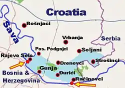 Croatia was affected by the floods to a lesser extent than Serbia or Bosnia.[48] The most critical area was in southern Slavonia. The embankment on the Sava River was breached near Rajevo Selo and Račinovci, and thus evacuation was ordered for Gunja, Rajevo Selo and Račinovci. As of 19 May, around 15,000 people in easternmost parts of Croatia were evacuated from their homes.[49] One of the most critical points was the embankment of the Sava river in Slavonski Šamac, where the confluence of the Bosna and Sava is located. At that point the embankments were under severe pressure caused by the huge amount of water coming from Bosnia. Several officials stated that if this embankment were breached, the entire region of southern Slavonia, with a population of over 300 000, would be flooded.[50] There were also floods in Banovina region, in the towns of Hrvatska Kostajnica and Dvor, mostly caused by the river Una, whose level had not been as high since 1955.[51] Video: http://vimeo.com/96164094