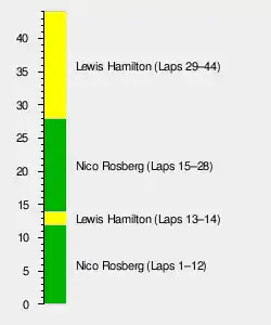 DRS was enabled on lap 24. Although Hamilton had closed Rosberg's lead to half a second and used DRS, he could not pass his teammate.[41] Räikkönen made a pit stop this lap,[43] which went wrong as his mechanics struggled to install a right-front wheel nut correctly. Hamilton tried to pass Rosberg again the following lap by running in his slipstream, but Rosberg held the line and had enough acceleration to defend first place. Hamilton held a tighter line, while Rosberg complained of more oversteer on lap 26.[39][41] On lap 27, Hamilton forgot to deactivate his DRS system and lost control of his rear; his brakes locked, and he went onto the turn one run-off area.[43][46] However, he caught up to Rosberg and ran closely behind his teammate into the hairpin without trying to pass.[41] Hamilton moved across the track during the lap in an attempt to pass;[43] Rosberg's car shuddered, and Hamilton got a better run onto the pit-lane straight. He was in Rosberg's slipstream before passing him on the outside heading into the first turn to take the lead on lap 29.[39][41][43] Hamilton pushed hard and pulled away from Rosberg, who lost control heading into the pit-lane straight.[41]