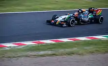 Magnussen made a second pit stop at the end of lap 16 to change his steering wheel.[41] On lap 17 Ricciardo went to the outside of Massa on the S-curves and moved inside, passing Massa to move into sixth.[43] Vettel overtook Bottas around the outside for fourth place on lap 18;[39][41] Bottas then fell to fifth on lap 19 when Ricciardo passed him around the outside at the S-curves. Vettel began to reduce the gap to third-place Button, with Ricciardo driving at a speed similar to his teammate. Bottas was caught by his Williams teammate Massa, who pulled away from Hülkenberg (who went off the track at the second turn).[41] Both Red Bull drivers were the fastest by lap 21, but Vettel was still 13 seconds behind Button and a further five seconds behind Rosberg, who now led Hamilton by only one second having run off the track at 130R.[43] A dry line began to emerge by this time as some drivers drove through standing water to keep their tyre temperatures down.[45]