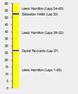 Pérez passed Räikkönen into turn 10 and took seventh when Bottas lost all tyre grip and fell from the top ten quickly. Because of the safety car period, the race ended under a two-hour time limit.[37] In the remaining eight laps, Hamilton distanced himself from Vettel and was the first to finish after 60 laps for his seventh victory of the season and the 29th of his career.[41][46] Vettel finished second in his best result of the season, 13.534 seconds behind,[40] and successfully held off teammate Ricciardo and Alonso in the final laps. Massa finished fifth. Vergne's five-second time penalty did not affect his sixth-place finish. Pérez, Räikkönen, Hülkenberg and Magnussen were seventh through tenth. Bottas, Maldonado, Grosjean, Kvyat and Ericsson, Bianchi and Chilton were the final finishers.[39] There were four lead changes in the race; three drivers reached the front of the field. Hamilton led three times for a total of 58 laps, more than any other driver.[47]