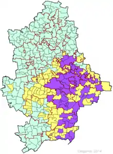 "Donbas" is an unofficial name of 2 the most eastern Ukrainian oblasts: Donetsk and Luhansk. About 5 million of eligible voters live there, that is 14% of the whole number of voters in Ukraine. After an active phase of war in Donbas in the summer 2014 and September ceasefire, roughly a half of the region remained to be controlled by separatists loyal to Yanukovych. On the day before the election, the CEC stated that there was no ability to provide voting in the captured areas.[3] Thus, full-fledged voting was provided only in 8 districts of 32. Other 9 districts were split by the front line for controlled and not controlled areas, so voting was provided there only partly. In 2 of them only slight number of polling station was opened: in 53rd district only 9% of voters were able to vote and in 45th district only 2%. In spite of this, the elections in these single-member constituencies were recognized as successful, and the winners (Oleh Nedava and Yukhym Zvyahilsky) got mandates. To the other 15 districts ballots were not transferred at all.
