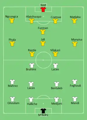 South Africa took the lead in the 51st minute, as Thuso Phala shot home a pass from Sibusiso Vilakazi. They missed the chance to increase the lead four minutes later after Tokelo Rantie's penalty, awarded for a foul on Vilakazi by Aïssa Mandi, hit the bar and went out, and conceded the equalizer in the 67th minute, as Thulani Hlatshwayo headed Yacine Brahimi's cross into his own goal. Algeria took the lead as Faouzi Ghoulam received Sofiane Feghouli's cross, ran into the penalty area and hammered past the goalkeeper, and sealed the win in the 83rd minute, after Ishak Belfodil fed Islam Slimani, whose shot squirmed through the goalkeeper's hands.[5][6]
