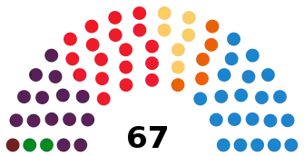 Voting for the Cortes was on the basis of universal suffrage, which comprised all nationals over eighteen, registered in Aragon and in full enjoyment of their political rights. Additionally, Aragonese people abroad were required to apply for voting before being permitted to vote, a system known as "begged" or expat vote (Spanish: Voto rogado).[2] The 67 members of the Cortes of Aragon were elected using the D'Hondt method and a closed list proportional representation, with an electoral threshold of three percent of valid votes—which included blank ballots—being applied in each constituency. Seats were allocated to constituencies, corresponding to the provinces of Huesca, Teruel and Zaragoza, with each being allocated an initial minimum of 13 seats and the remaining 28 being distributed in proportion to their populations (provided that the seat-to-population ratio in the most populated province did not exceed 2.75 times that of the least populated one).[1][3]