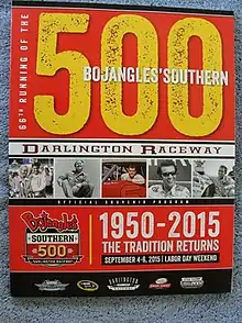 "Auto Club Speedway and Atlanta Motor Speedway did their best to maintain the tradition of Sprint Cup Series racing on the final holiday weekend of the summer, but both came up short. Thankfully, the sanctioning body shuffled a handful of races on this year's schedule to put the Bojangles' Southern 500 back where it began in 1950."source=Motor Racing Network lead writer and co-host of The Morning Drive on Sirius XM NASCAR Radio Pete Pistone giving his thoughts on the return of the Bojangles' Southern 500 to Labor Day weekend[13]