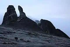During the earthquake, one of the peaks on Mount Kinabalu (called the Donkey's Ears) was broken off.[11] The source of the Poring Hot Springs a popular tourist area near Ranau, turned murky and black[47] for a few hours due to the earthquake, which disrupted a clay deposit that interrupts the fault gap that heats up the rainwater.[20] Some infrastructure was reported damaged with around 23 schools in six different districts affected, and Ranau Mosque was also damaged due to the tremor.[48][49]