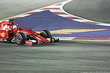 Before the formation lap, Rosberg appeared to have an issue with his car, when he stopped at the end of pit lane on the way to the start grid. However, his mechanics were able to rectify the problem, described by Niki Lauda as "a glitch", and he made it to the grid.[32] With everyone starting on the super-soft tyre compound, a race with two pit stops was expected for most drivers.[32] At the start, all drivers at the front of the field held their positions, while further back, Nico Hülkenberg, who had a good start, and Sergio Pérez nearly collided while fighting for position.[33] Max Verstappen's Toro Rosso STR10 stalled on the grid and was pushed back to the pit lane, only to start his race shortly after, more than one lap down on the leaders.[32] Vettel was able to build a gap to Ricciardo behind him quickly, leading the Red Bull by three seconds after the first lap. Fernando Alonso, who had enjoyed a decent start to move up into eleventh, came under pressure from Sainz by lap four, followed by Grosjean, who lost places at the start because he had to move around the stationary Verstappen. While Vettel's lead was about five seconds on lap five, Verstappen unlapped himself by lap six and posted fast lap times.[32] Meanwhile, Nico Rosberg held off the two Williams cars of Bottas and Massa, while Lewis Hamilton in front was able to move clear of the pack fighting for sixth place.[33] Kimi Räikkönen in third place was held at a distance by Ricciardo, trailing him by 1.6 seconds on lap nine. A lap later, Grosjean became the first driver to pit. More cars came in on lap eleven, leading to heavy traffic that prevented Sainz and Alonso from leaving their pit boxes, costing time. Alonso emerged from pit lane ahead of Grosjean, who moved past him into thirteenth. Felipe Massa had a slow stop of 4.8 seconds when he made a pit stop at the end of lap 13. When he emerged from pit lane, Nico Hülkenberg was approaching on the racing line. Both drivers collided, with Hülkenberg being catapulted off Massa's front right tyre, causing him to retire from the race.[32][34] A Virtual Safety Car period ensued, that saw all drivers pit that had not done so before. Since Kvyat had made a pit stop shortly before the safety car was deployed, both Mercedes cars were able to move in front of him, leaving Kvyat in sixth place. Jenson Button's stop took a long time, dropping him to 16th place. By lap 16, the virtual was replaced by the actual safety car, which stayed out until the end of lap 18.[32]