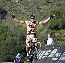 BMC Racing Team led the peloton hard into the early slopes of Jebel Akhdar. This caused many riders, including race leader Fabian Cancellara, to be dropped, and a group of 20 riders formed. Vincenzo Nibali (Astana) put in two attacks, causing the group to be reduced further, in support of Jakob Fuglsang. More riders, including Alejandro Valverde (Movistar Team) were dropped, leaving a group of three riders in the lead with 1 kilometre (0.6 miles) to go: Rafał Majka (Tinkoff–Saxo), Tejay van Garderen (BMC Racing Team) and Rafael Valls (Lampre–Merida).[25][26] Majka was unable to follow van Garderen's attacks, but Valls was able to stay in his wheel. Valls was then able to put in his own attack and pass van Garderen in the final part of the stage, going on to win by five seconds. It was his first victory in five years and gave him a 19-second lead in the overall standings. Van Garderen was frustrated after the stage, having also finished second on the same stage in 2014, behind Chris Froome.[27] He said afterwards that he had "underestimated" Valls, who had not been considered among the favourites for stage victory.[28] Louis Meintjes (MTN–Qhubeka) was eighth on the stage and moved into the white jersey as the best young rider.[26]