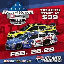 The 2016 Folds of Honor QuikTrip 500 was a NASCAR Sprint Cup Series race held on February 28, 2016, at the Atlanta Motor Speedway in Hampton, Georgia. Contested over 330 laps—extended from 325 laps due to an overtime finish, on the 1.54-mile-long (2 km) asphalt quad-oval intermediate speedway, it was the second race of the 2016 NASCAR Sprint Cup Series season. Jimmie Johnson won the race, the 76th of his career. This drew him level with Dale Earnhardt for seventh on the all-time wins list and third in NASCAR's post-1972 "modern era." Teammate Dale Earnhardt, Jr. finished second. Kyle Busch, Kurt Busch and Carl Edwards rounded out the top-five.