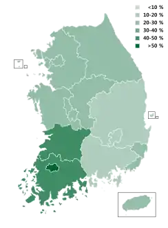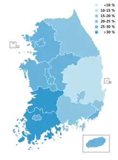 | South Gyeongsang | 12 | 44.0% | 3 | 24.4% | 0 | 17.4% | 1 | 6.5% | 0 | 7.7% | 0 | 16 |