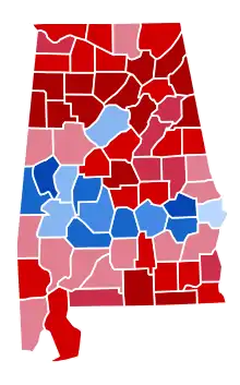 Alabama has voted for the Republican candidate in every election since it was won by Ronald Reagan in 1980. As such, Trump was heavily favored to win the state. On the day of the election, Trump won the election in Alabama with 62.08% of the vote, while Clinton received 34.36% of the vote.[3] The state had given 60.55% of its votes to Republican nominee Mitt Romney in 2012, meaning that it had shifted 1.53% more Republican from the previous election. Trump's margin of victory in Alabama was 27.72%, a 5.53% increase from Romney's 22.19% margin of victory.