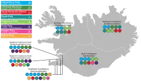 The 63 members of the Althing are elected using open list proportional representation in 6 multi-member constituencies.[16] Of the 63 seats, 54 are elected using constituency results and determined using the d'Hondt method. The remaining nine supplementary seats are awarded to parties that crossed the 5% national electoral threshold in order to give them a total number of seats equivalent to their national share of the vote.[16]