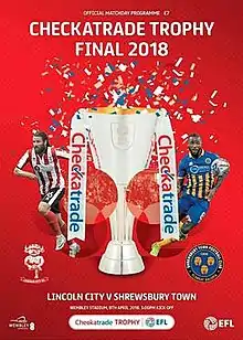 The 2018 EFL Trophy Final was a football match that took place on 8 April 2018 at Wembley Stadium, London. It was the final match of the 2017–18 EFL Trophy, the 34th edition of the EFL Trophy, a competition for the 48 clubs in EFL League One and EFL League Two, and 16 under-21 sides from Premier League and EFL Championship clubs. It was contested by Lincoln City, from League Two, and Shrewsbury Town, from League One. Lincoln City won the game 1–0, with the goal scored by Elliott Whitehouse. It was Lincoln's first cup win in any competition.[1] [2]