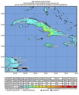 At 2:10 p.m. local time (UTC-5) on 28 January 2020, an earthquake of 7.7 Mw struck on the north side of the Cayman Trough, north of Jamaica and west of the southern tip of Cuba, with the epicenter being 80 miles (130 km) ESE of Cayman Brac, Cayman Islands[4] or 83 miles (134 km) north of Montego Bay, Jamaica.[5] Schools in Jamaica and buildings in Miami were evacuated after shaking was observed in parts of the U.S. state of Florida.[6][7] Light shaking was also reported on the Yucatan peninsula in Mexico.[8] It is the largest earthquake in the Caribbean since 1946.[9] A tsunami warning for the Caribbean Sea was issued by the Pacific Tsunami Warning Center and later withdrawn.[10]