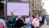 Egyptian voters lining up according to social distancing procedures in front of a polling station