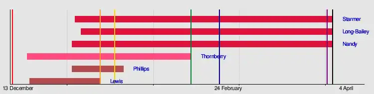 The deadline for PLP and EPLP nominations was 2.30 pm on 13 January.[57] Lewis, with only five nominations including himself, withdrew from the contest shortly before the deadline.[58] Thornberry was also short of the required nominations at the beginning of the day, but managed to obtain enough to qualify less than ten minutes before the deadline, helped by MPs who had formerly nominated Lewis.[59] After the close of nominations, the party announced that Long-Bailey, Nandy, Phillips, Starmer and Thornberry would proceed to the next stage of the election.[60] Starmer received 88 nominations, more than any other candidate, followed by Long-Bailey with 33 and Nandy with 31.[61] Phillips and Thornberry were each nominated by 23 MPs and MEPs, one more than the minimum requirement of 22. Shortly after these nominations were published, Starmer was heavily favoured in the betting odds.[59]