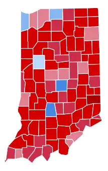 Notably, Biden reduced the Republican margin in Hamilton County, a suburban county in the Indianapolis metropolitan area that is the state's fourth-most populous county.[5] Hamilton County has never supported a candidate of the Democratic Party for president except for 1912, when the split in the Republicans allowed Woodrow Wilson to carry the county with a 34.9% plurality.[4] Hamilton broke 60%-38% for John McCain in 2008, when Barack Obama won Indiana. Mitt Romney won Hamilton County 66%-32% in 2012 and Trump won it 56%-37% in 2016, nearly identical to his statewide margin. In this election, Trump narrowly won Hamilton County, 52%-45%, a margin that is to the left of the statewide result. Biden's 45% vote share in Hamilton County is higher than that of even Lyndon B. Johnson in his nationwide landslide in 1964 and higher than that of Franklin D. Roosevelt in 1936.[4] Biden's vote share in Hamilton is only equaled by Roosevelt's 44.85% share in his 1932 landslide.