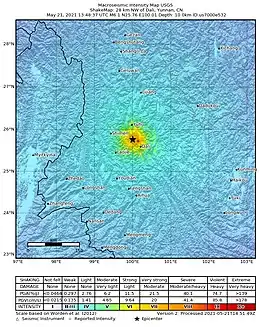 On May 21, 2021, a 6.1 magnitude earthquake strucked the Dali City, Yunnan, China, at a depth of 10.0 km.[1] Three people died during the quake, while another 32 were injured.[6][7] The earthquake was referred by the Chinese media as the 5.21 earthquake or 2021 Yangbi earthquake.