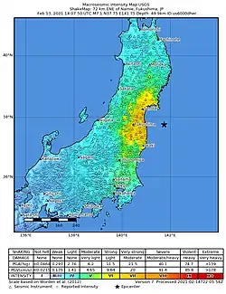 According to the Japan Meteorological Agency, the earthquake had a maximum intensity of Shindo 6 Upper, corresponding to intensity VIII (Severe) to X (Extreme) on the Mercalli intensity scale.[12] These intensities were recorded in Fukushima and Miyagi prefectures. However, the Earth Science and Disaster Prevention Research Institute found that the earthquake may have also caused shaking as high as Shindo 7 in Yamamoto, Miyagi.[4] At the same location, the maximum peak acceleration caused by the earthquake was recorded at 1,432 gals, far exceeding the 980 gals and 1,362 gals recorded in Mashiki, Kumamoto during the 2016 Kumamoto earthquakes which were assigned Shindo 7.[5] This event which occurred near the deeper portion of the subduction interface generated short-period seismic energy which caused severe shaking at the coast.[33]