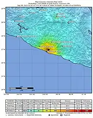 A moment magnitude Mw 7.0 or 7.1 earthquake occurred near the city of Acapulco in the Guerrero state of Mexico at 20:47 local time on 7 September with an estimated intensity of VIII (Severe) on the MMI scale.[1][2] The earthquake killed 13 people and injured at least 23 others. At least 1.6 million people in Mexico were affected by the earthquake which resulted in localized severe damage. The earthquake occurred on the anniversary of the 2017 Chiapas earthquake which measured Mw 8.2.[4] It was also the largest earthquake in Mexico since the 2020 Oaxaca earthquake.[5]